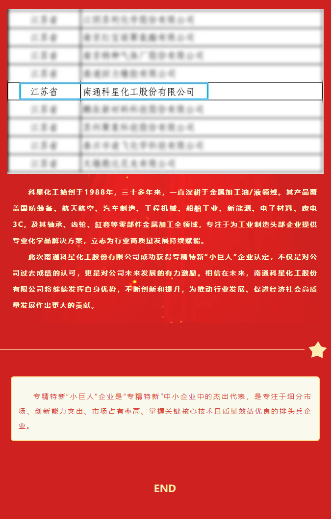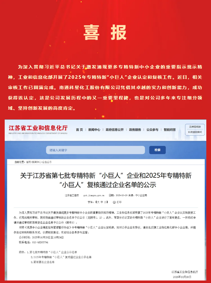 喜報(bào)!南通科星化工股份有限公司榮獲國(guó)家專精特新“小巨人”企業(yè)認(rèn)定